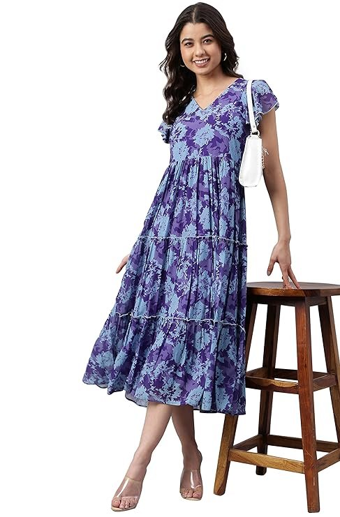 - Style:- Length: 44(inch) | Pattern: Printed | Occasion: Casual | Type: Flared | Sleeve Type: Short Sleeve(Cap Sleeve) | Color: Blue